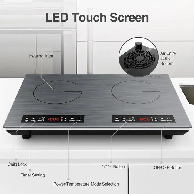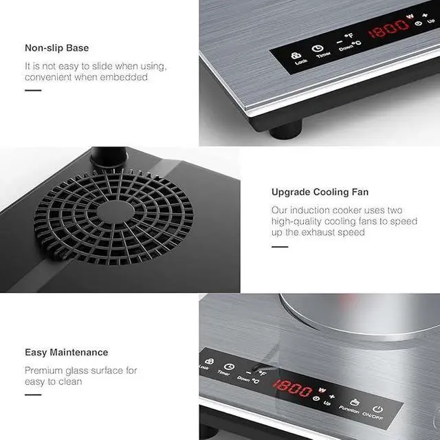 Safety Induction Stove:The induction cooktop 2 burner is equipped with a child safety lock, timer and overheat protection device, and the round edges without sharp corners. Set the timer from 1 minute to 180 minutes. Induction stove top The use of two upgraded low-noise cooling fans can greatly improve the heat dissipation effect. Safe and user-friendly.