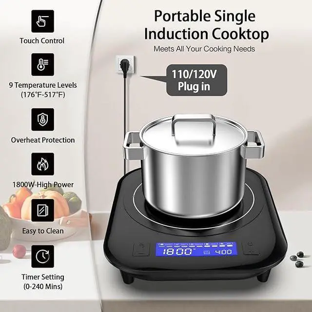 Induction Cooktop,1800W 110V Single Burner Cooktop,Induction Hot Plate with 5 Cooking Modes, Electric burner with LCD touch control,9 Temperature Levels & 4H Timer,Overheat protection