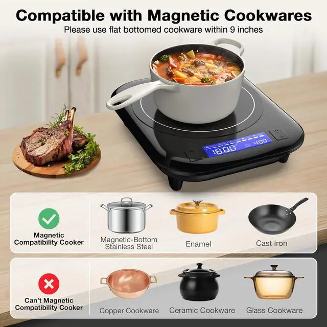Suitable for Cookware : GIHETKUT countertop burners is compatible with cast iron, iron, electromagnetic steel, enamel, and stainless steel with a magnetic bottom. Please use flat bottomed cookware within 9 inches,If the cooker is incompatible, the screen will display the E0 code. Induction Hot plate (Limited to flat bottomed cookware, only when the bottom is in full contact with the induction cooker can it be quickly heated),Low and high-pressure alarm system.