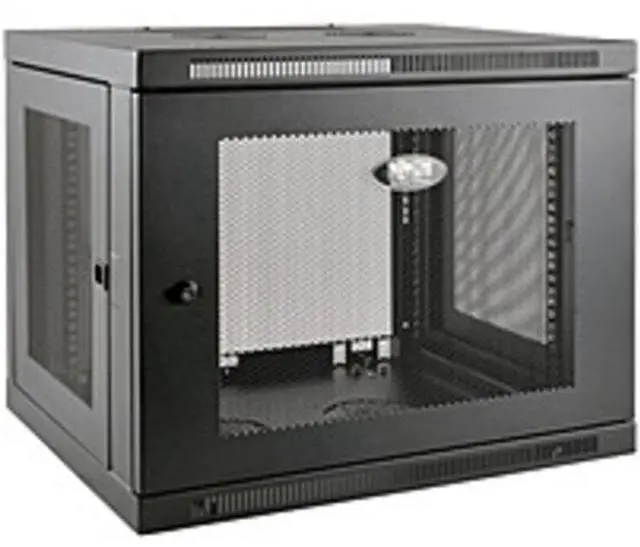 The SRW9UDP SmartRack 9U Low-Profile Switch-Depth-Plus Wall-Mount Rack Enclosure Cabinet is designed to house EIA-standard 19-inch rack equipment in network wiring closets, retail locations, classrooms, back offices and other areas with limited floor space where you need equipment to be secure, organized and out of the way. Constructed from heavy-duty steel with a durable black powder-coated finish, the cabinet has a maximum load capacity of 200 pounds. The side panels and front door lock securely to help prevent damage, tampering or theft. The front, top, bottom and removable side panels are vented, which allows air to flow freely and keep equipment cool.