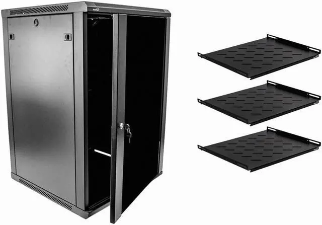 This 600mm depth cabinet by NavePoint is part of the Pro Series and can be wall-mounted or self standing and is great for organizing your networking equipment. It has removable, locking side panels for easy access, along with venting slots and (2) built-in fans to keep your equipment cool. Comes with (3) component shelves. Made of high-quality SPCC Cold Rolled Steel with electro-static powdered coated finish. Comes flat-packed and requires some assembly. Available in 6U, 9U, 12U, 15U and 18U configurations.