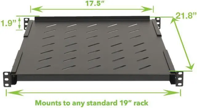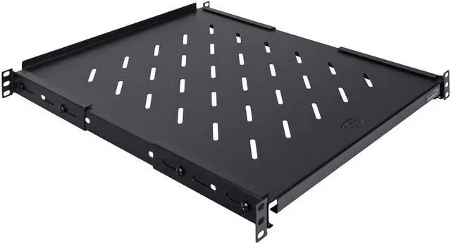 The black 4-post shelf has a powder coated finish for wear and tear resistance and is universally compatible with different 4-post racks and cabinets. This sturdy vented shelf is designed to fit into virtually any EIA-ECA 310E compliant 19 inch rack. This strong adjustable 4-post shelf has a fixed surface area of 16.2" x 21.7" with a weight capacity of 242 lbs.