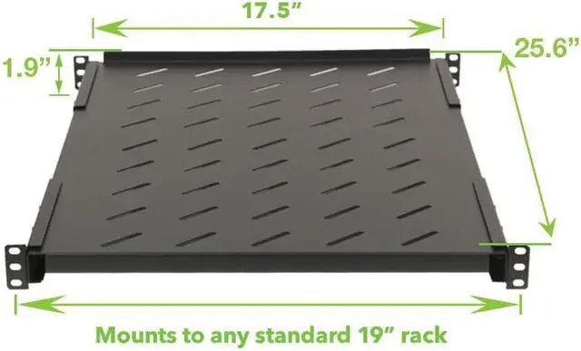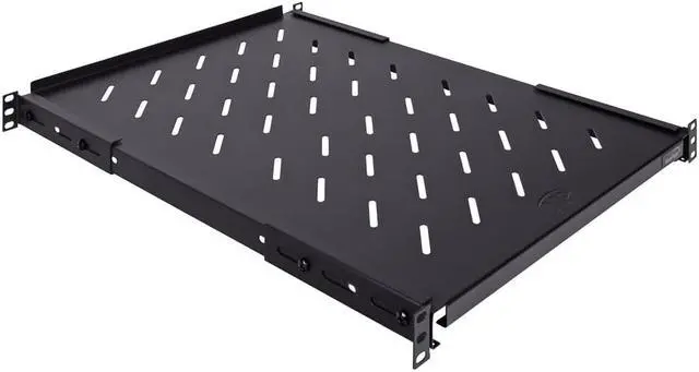The black 4-post shelf has a powder coated finish for wear and tear resistance and is universally compatible with different 4-post racks and cabinets. This sturdy vented shelf is designed to fit into virtually any EIA-ECA 310E compliant 19 inch rack. This strong adjustable 4-post shelf has a fixed surface area of 16.2" x 25.5" with a weight capacity of 242 lbs.