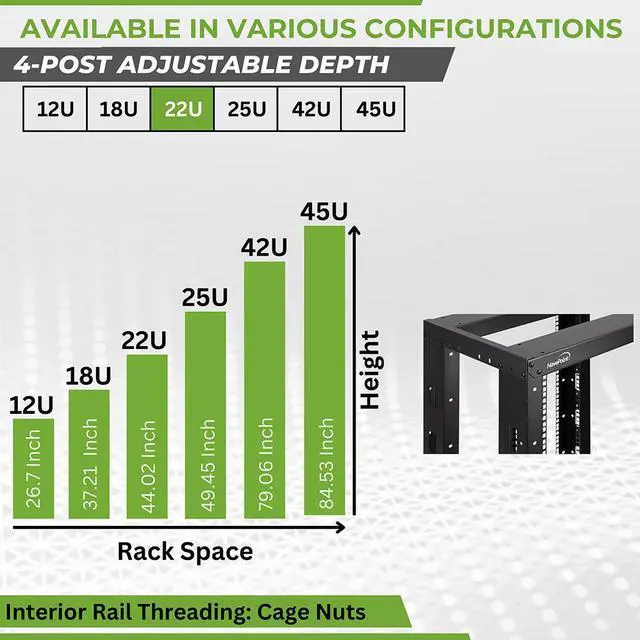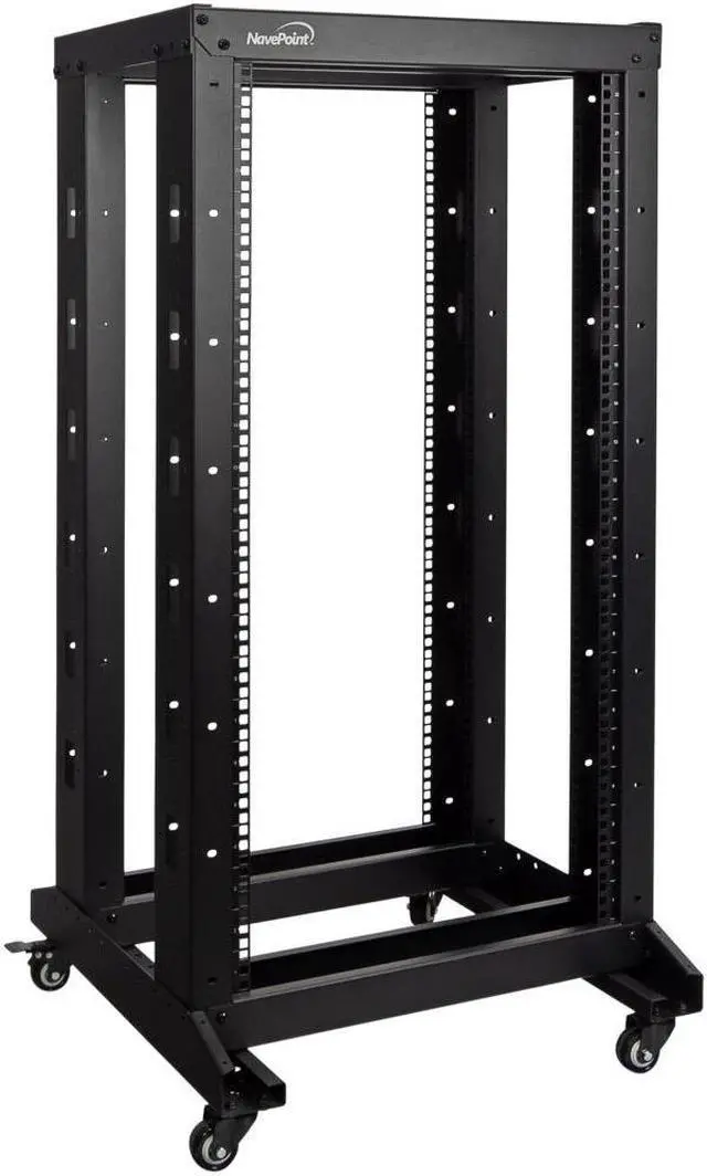 This 4-post open frame adjustable depth rack by NavePoint is great for organizing your networking equipment. Comes flat-packed and requires some assembly. Made of high-quality SPCC Cold Rolled Steel with a powdered coated finish for durability. The rack comes equipped with casters for easy movement and relocation of equipment. Available in a variety heights.