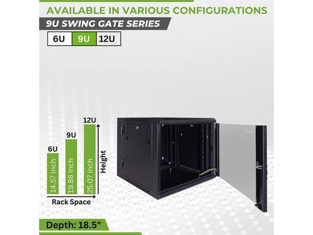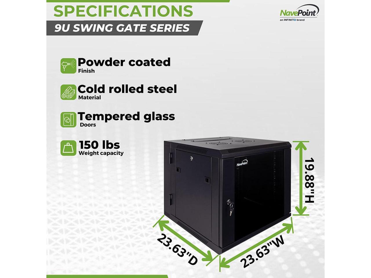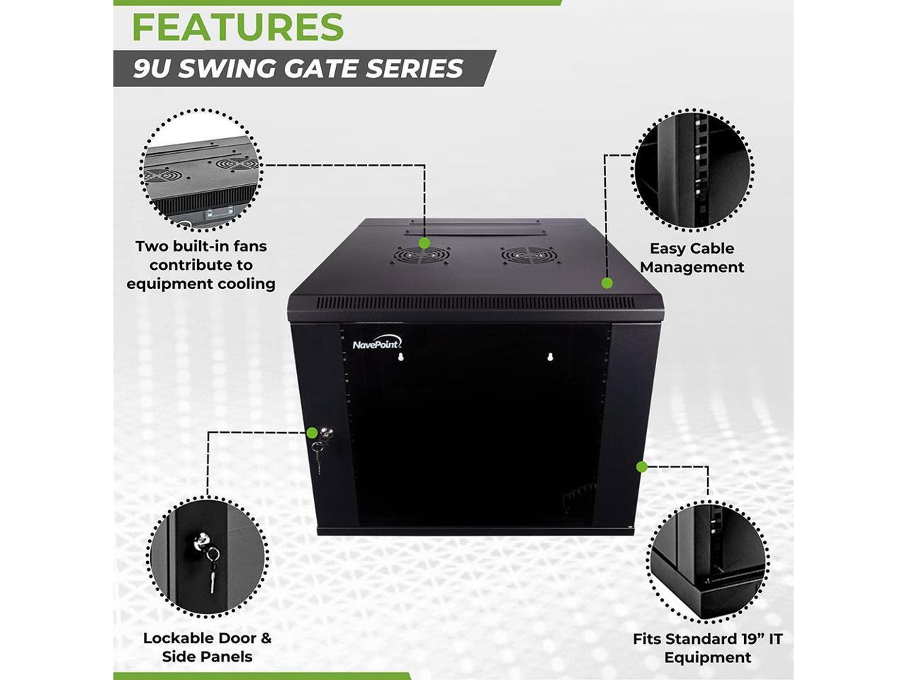 NavePoint 9U Wall-Mount Network Cabinet Enclosure, 600mm Depth, Hinged Back, Swing Gate Server Cabinet, Locks, Pre-Assembled, Reversible Glass Front Door, 1 x L Brackets , 2 Fans, Cable Management