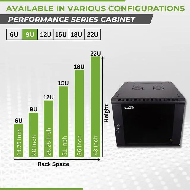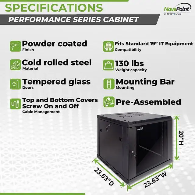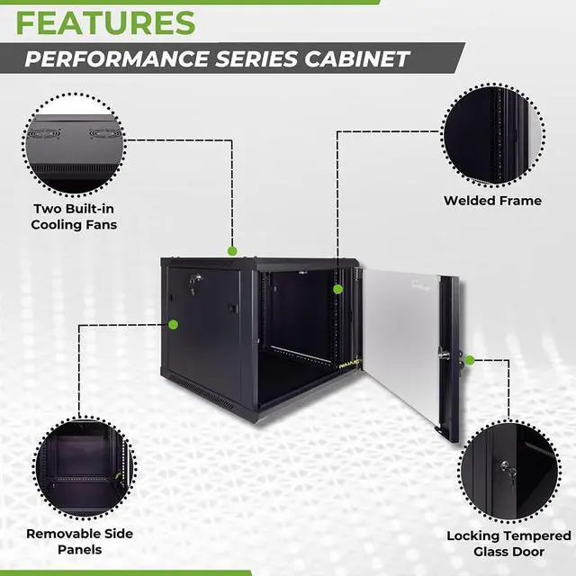 This 600mm depth cabinet by NavePoint is part of the Performance Series and can be wall-mounted or self standing and is great for organizing your networking equipment. It has removable, locking side panels for easy access, an L-shaped spring pin for fast door opening direction changes, and (2) built-in fans to keep your equipment cool. Made of high-quality SPCC Cold Rolled Steel. Comes flat-packed and requires some assembly.