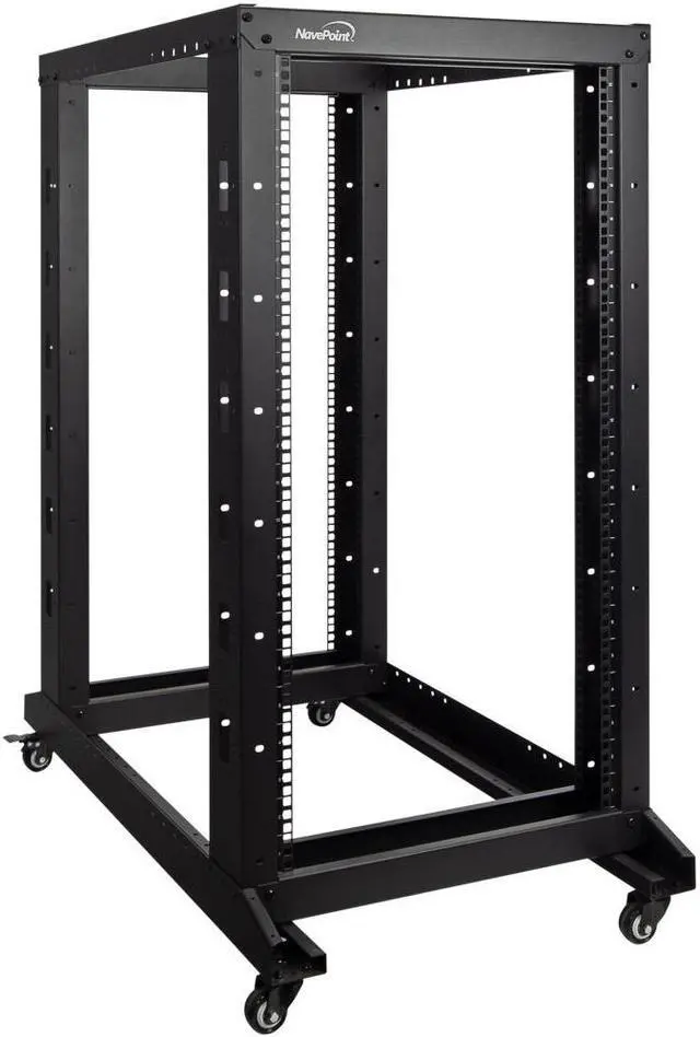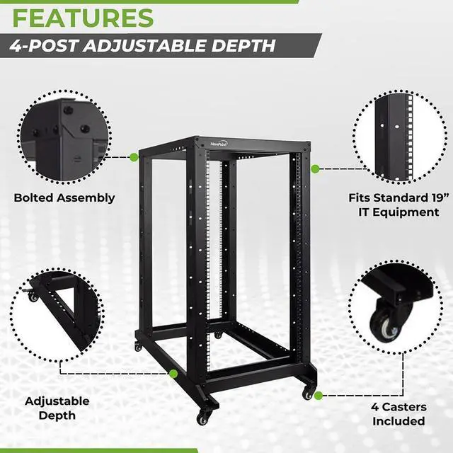 This 4-post open frame adjustable depth rack depth by NavePoint is perfect for mounting servers and other networking equipment. Comes flat-packed and requires some assembly. Made of high-quality SPCC Cold Rolled Steel with a powdered coated finish for durability and has static weight capacity of 881 lbs. The rack comes equipped with casters for easy movement and relocation of equipment. Available in a variety of heights and depths.