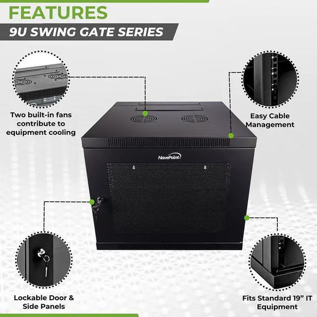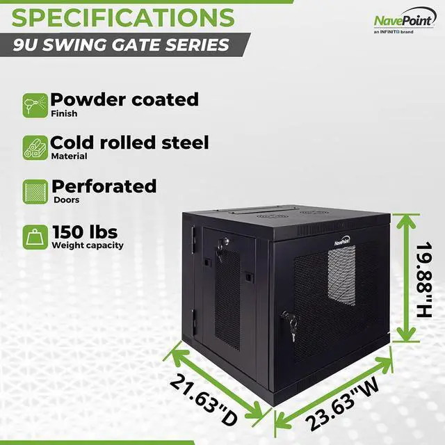 The NavePoint Swing Gate Series, 9U, Wall-Mount Network Cabinet can be used for network closets, retail locations, schoools, IT shops, home users, and any area where space is limited, security is important and routine access to equipment is necessary. This Wall-Mount Network Cabinet supports your equipment to a maximum weight of 150 lbs.