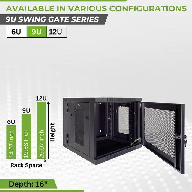 The 9U hinged cabinet swings away from the wall to allow easy rear access to equipment and cabling during and after installation. Constructed with 16 gauge heavy-duty cold rolled steel with a black powder coated finish, this cabinet delivers excellent utility and durability for your installation. This Wall-Mount cabinet has a perforated door and side panels to promote air circulation and cooling to prevent potential overheating of equipment. It's a reliable Wall-Mount network cabinet with the design and construction to facilitate frequent access for service and maintenance. Adjust the vertical mounting rails up to 16 inches to accommodate network switches, patch panels, and other equipment.