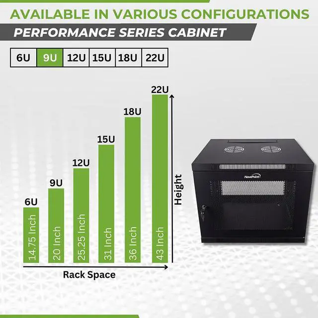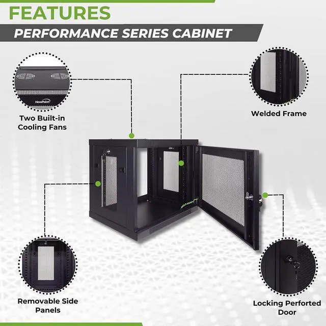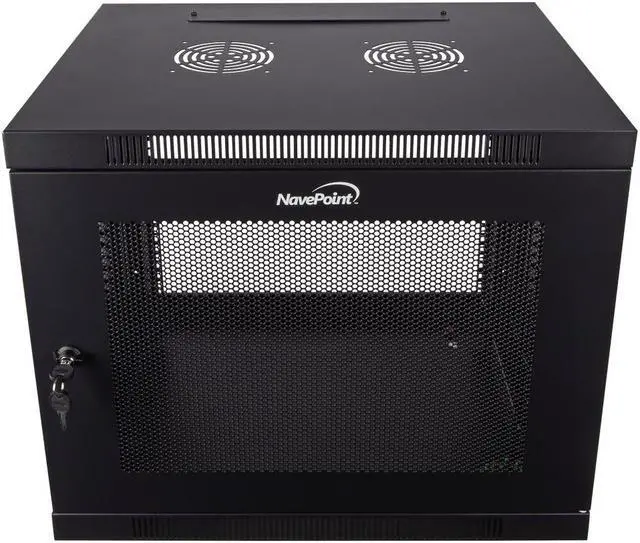 This cabinet by NavePoint can be wall-mounted or self standing and is great for organizing your networking equipment. Perforated side panels and door for peak efficiency in airflow. Made of high-quality SPCC Cold Rolled Steel. Comes fully assembled and ready to be wall mounted. Available in 6U, 9U, 12U, 15U and 18U configurations.