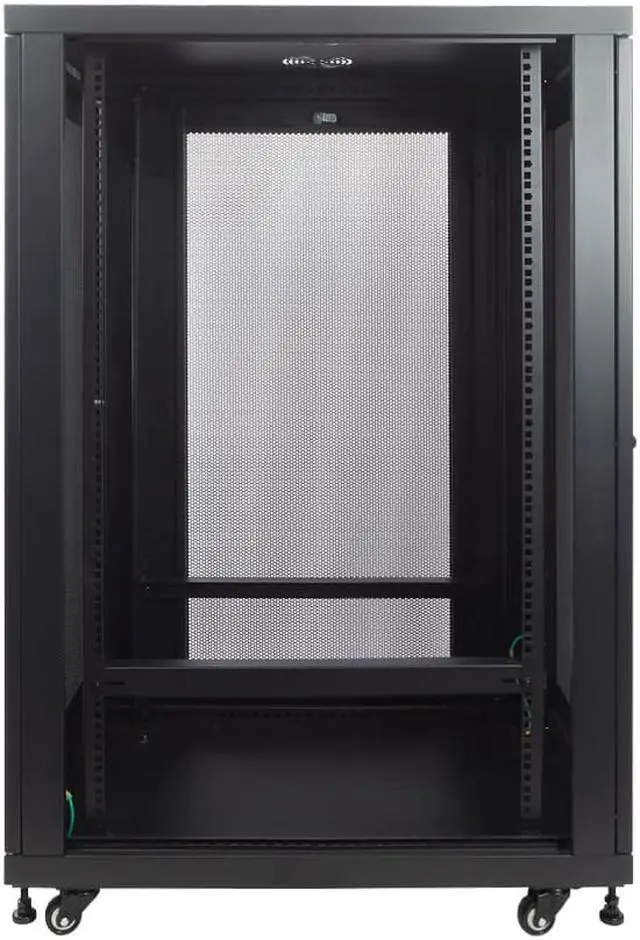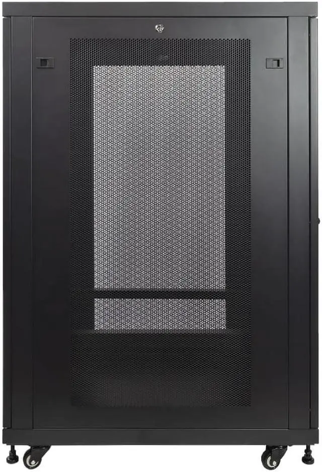 Perforated ventilation and pre-cut fan slots for user supplied fans help to keep your equipment cool. Cable management slots on the top and bottom keep whatever space you store your equipment neat and organized. The reversible door allows for accessibility no matter where you keep it. The cabinet is shipped fully assembled to allow for quick and easy setup and features both casters for easy maneuverability and leveling feet to lock it into place.