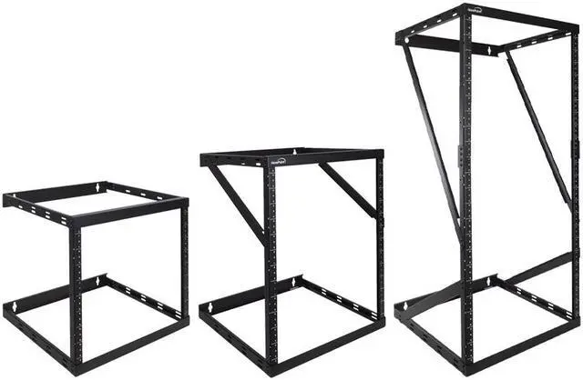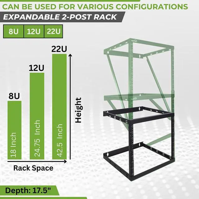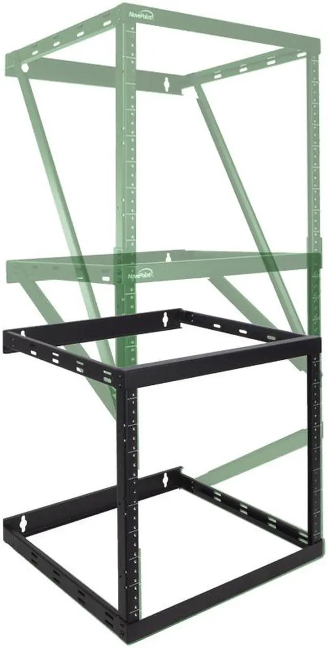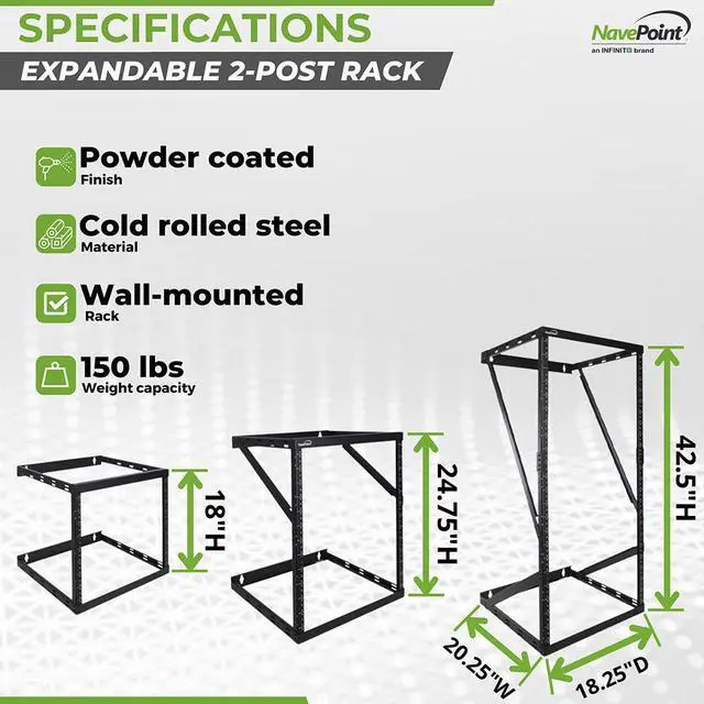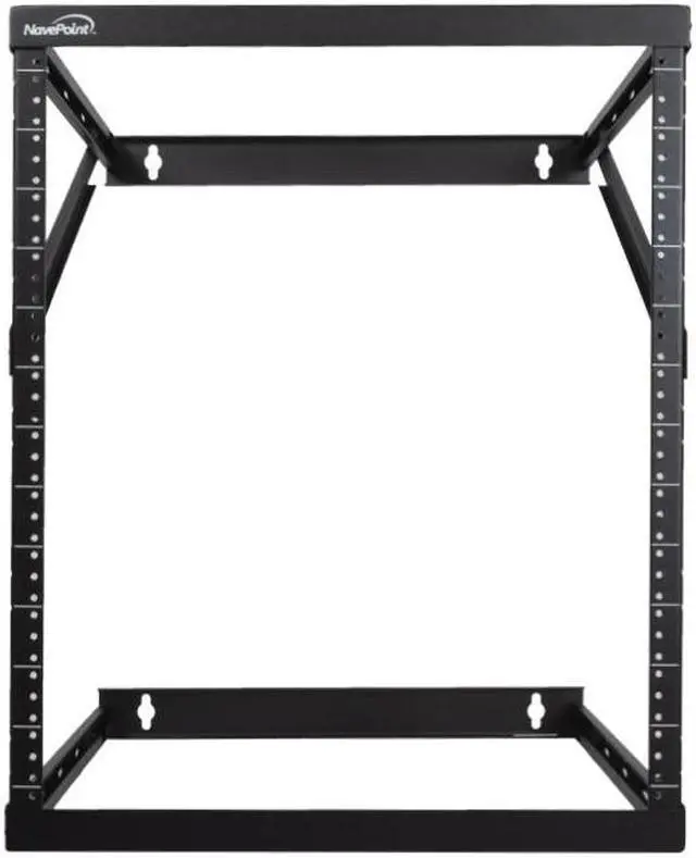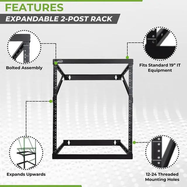 NavePoint's 8U, 12U, 22U Low Profile Expandable Height Adjusting Wall Mount 2 Post Open Frame Network / Server rack is perfect for mounting your Patch Panels, Battery Packs, UPS Systems, Network Switches, or other IT equipment and to give you back your floor space. It's minimal low profile design takes up little space while being able to handle up to 150 pounds of equipment with it's solid high quality steel frame. The vertical mounting rails are threaded for 12-24 screws and have a powder coated finish.