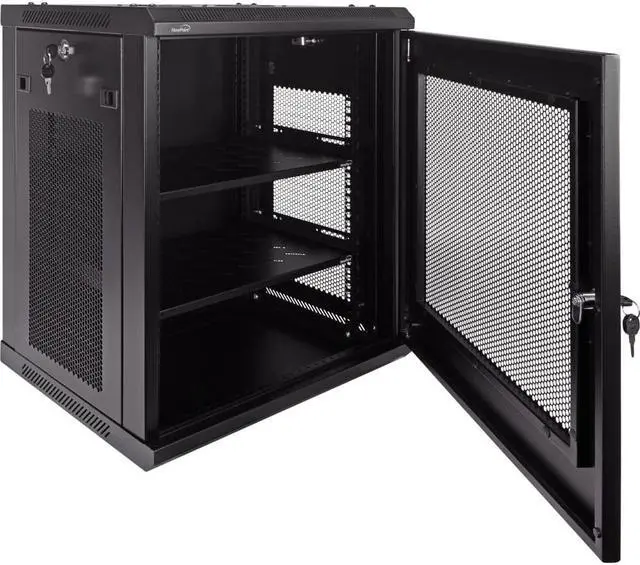 This 450mm depth cabinet by NavePoint is part of the Pro Series and can be wall-mounted or self standing and is great for organizing your networking equipment. It has removable, locking side panels for easy access, along with venting slots and (2) built-in fans to keep your equipment cool. Comes with (2) component shelves. Made of high-quality SPCC Cold Rolled Steel with electro-static powdered coated finish. Comes flat-packed and requires some assembly. Available in 6U, 9U, 12U, 15U and 18U configurations.