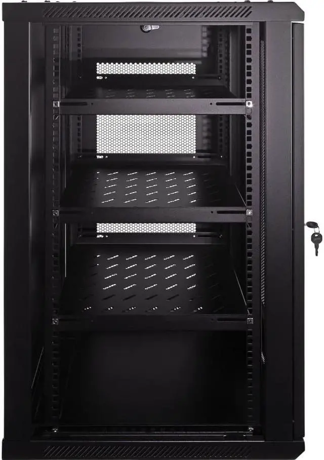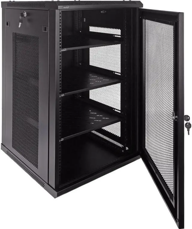 This 600mm depth cabinet by NavePoint is part of the Pro Series and can be wall-mounted or self standing and is great for organizing your networking equipment. It has removable, locking side panels for easy access, along with venting slots and (2) built-in fans to keep your equipment cool. Comes with (3) component shelves. Made of high-quality SPCC Cold Rolled Steel with electro-static powdered coated finish. Comes flat-packed and requires some assembly. Available in 6U, 9U, 12U, 15U and 18U configurations.