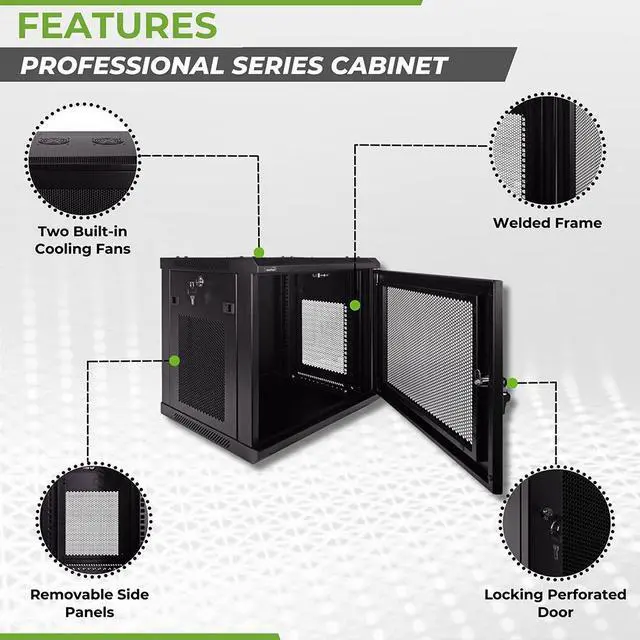 This 450mm depth cabinet by NavePoint is part of the Pro Series and can be wall-mounted or self standing and is great for organizing your networking equipment. It has removable, locking side panels for easy access, along with venting slots and (2) built-in fans to keep your equipment cool. Made of high-quality SPCC Cold Rolled Steel with electro-static powdered coated finish. Comes flat-packed and requires some assembly. Available in 6U, 9U, 12U, 15U and 18U configurations.