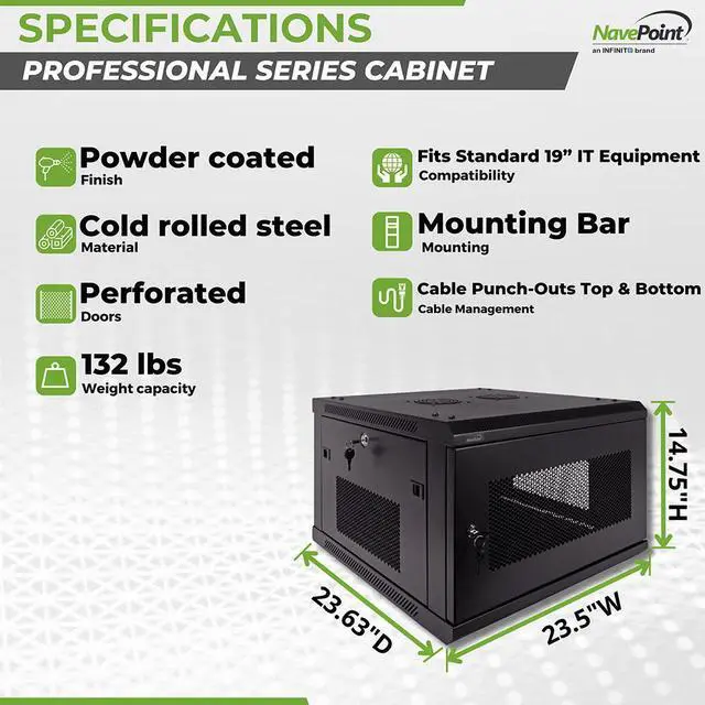 This 450mm depth cabinet by NavePoint is part of the Pro Series and can be wall-mounted or self standing and is great for organizing your networking equipment. It has removable, locking side panels for easy access, along with venting slots and (2) built-in fans to keep your equipment cool. Made of high-quality SPCC Cold Rolled Steel with electro-static powdered coated finish. Comes flat-packed and requires some assembly. Available in 6U, 9U, 12U, 15U and 18U configurations.