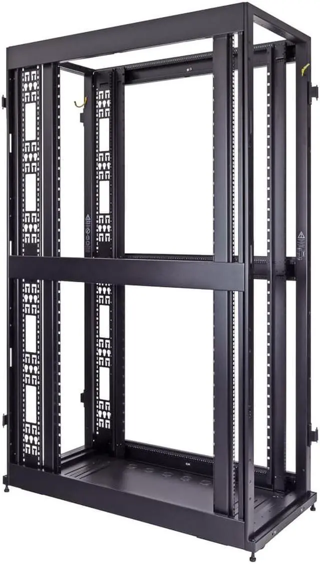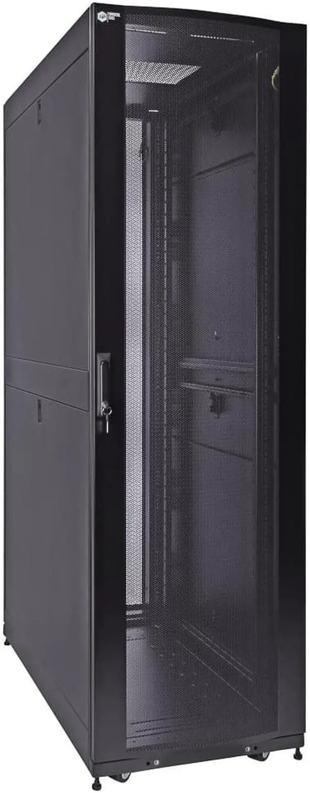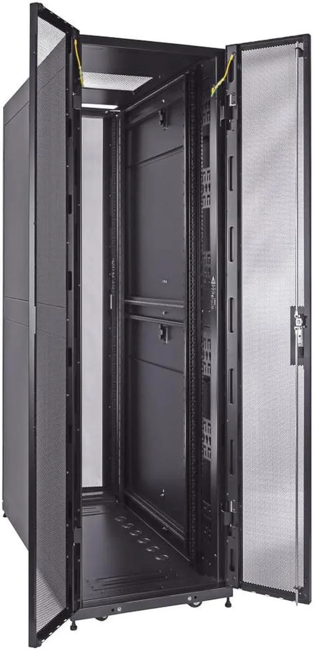 Reversible and lockable front door and split style French rear doors are perforated to allow for increased airflow. There are 4 quick release, lockable side panels, which allow for easy access to equipment. The included full height cable management rails allow for a tidy installation.