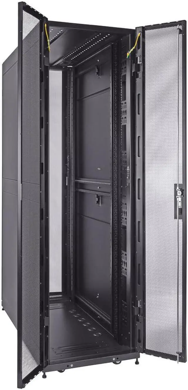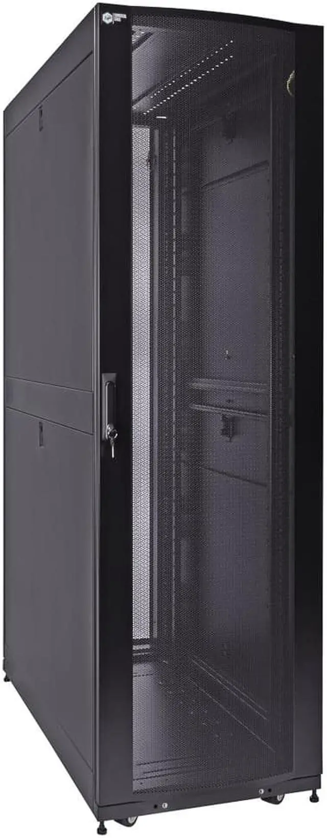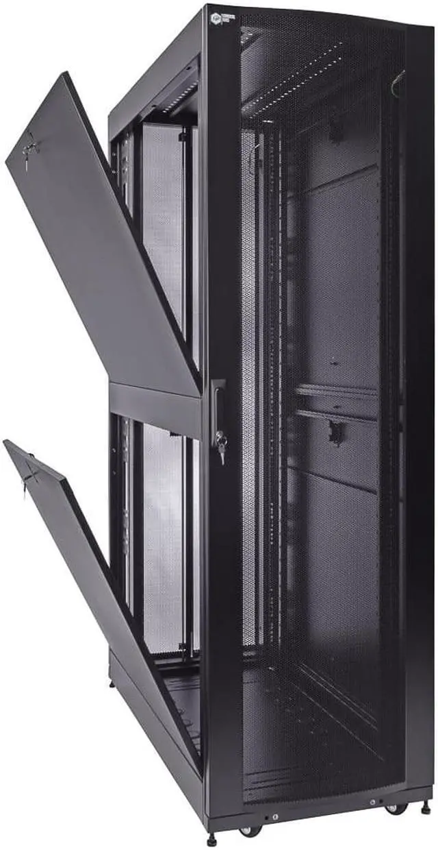 Reversible and lockable front door and split style French rear doors are perforated to allow for increased airflow. There are 4 quick release, lockable side panels, which allow for easy access to equipment. The included full height cable management rails allow for a tidy installation.