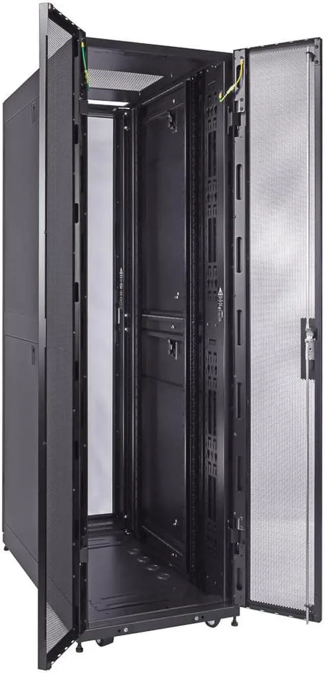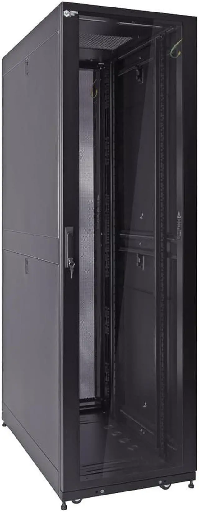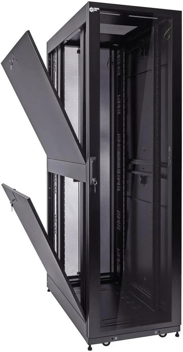 Reversible and lockable front door is glass for visibility and split style French rear doors is perforated to allow for increased airflow. There are 4 quick release, lockable side panels, which allow for easy access to equipment. The included full height cable management rails allow for a tidy installation.