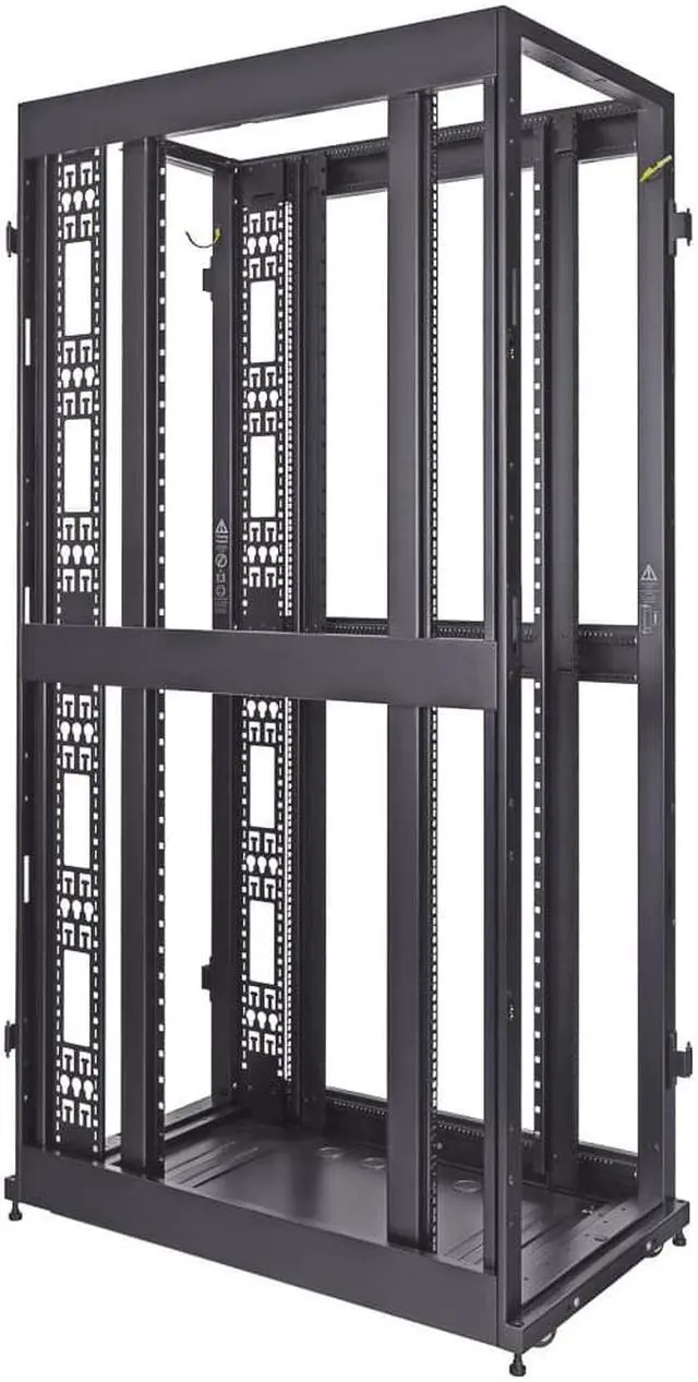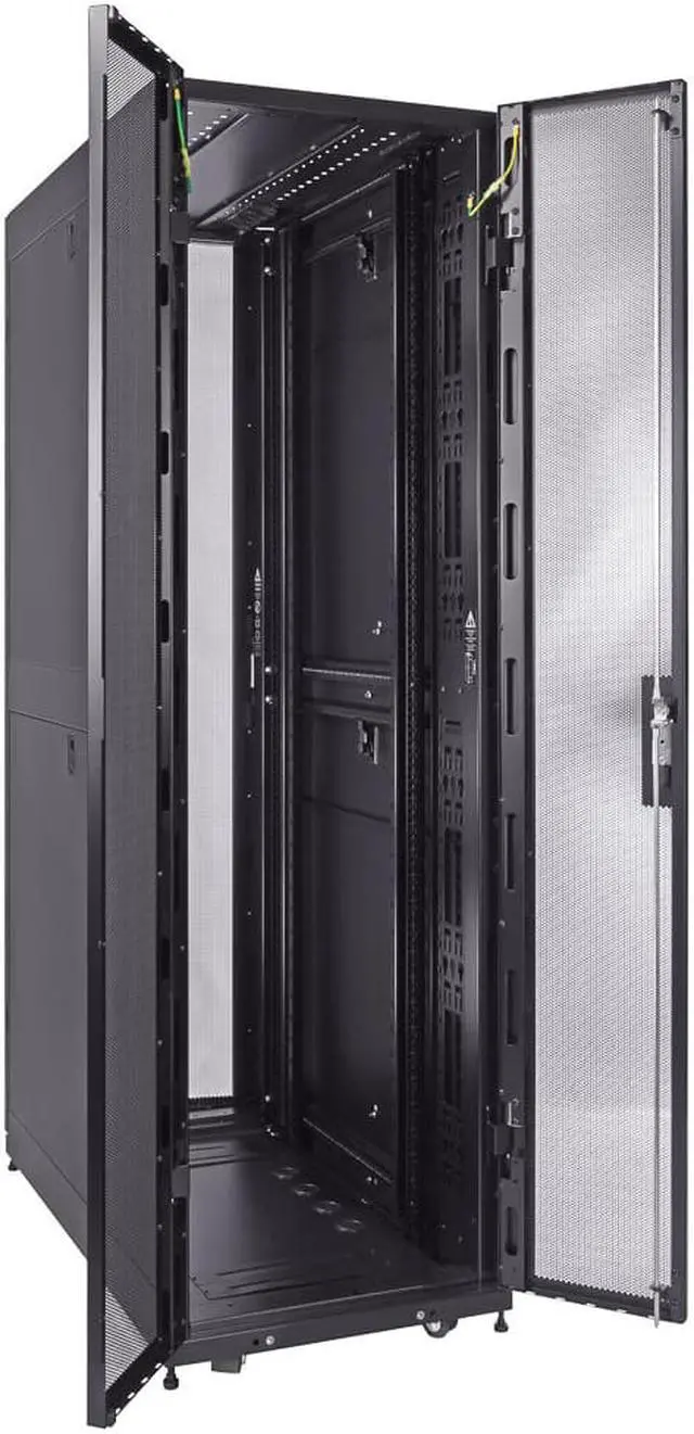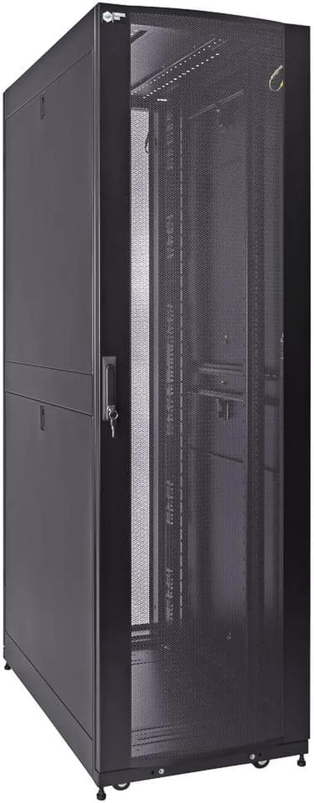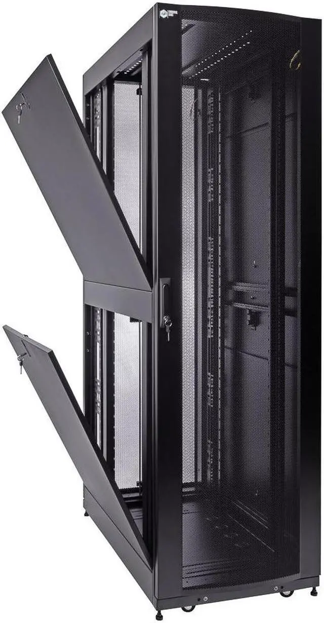 Reversible and lockable front door and split style French rear doors are perforated to allow for increased airflow. There are 4 quick release, lockable side panels, which allow for easy access to equipment. The included full height cable management rails allow for a tidy installation.