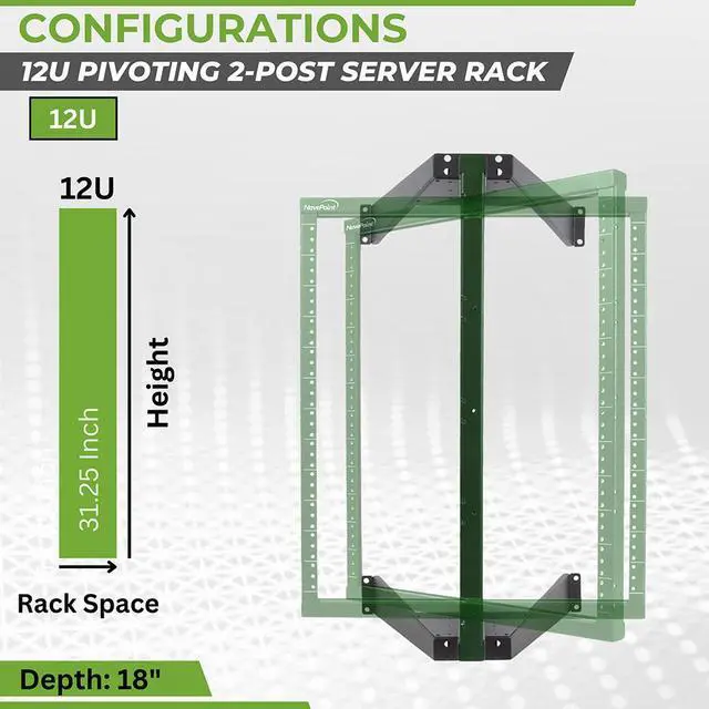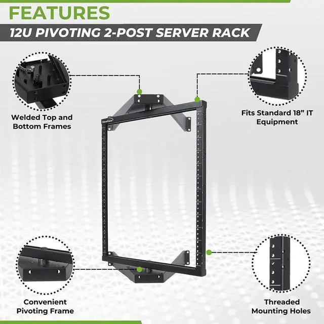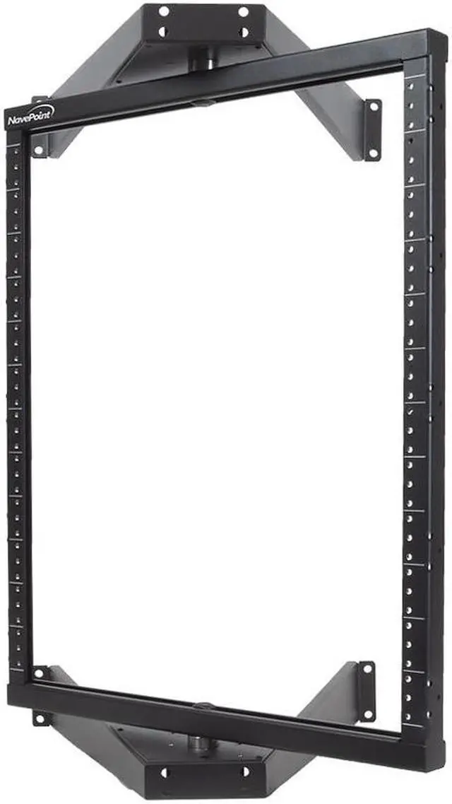 NavePoint's 12 U Switch Depth Low Profile Pivoting Wall Mount 2 Post Open Frame Rack stores 12U of your standard 19 inch rack mount server and networking equipment with a convenient pivoting frame to allow easy and instant access to all your wiring. Increase your floor space without losing any accessiblity. It's black powder coated heavy duty high quality steel frame can hold up to 150 pounds of equipment. Two sturdy locking pins hold the 2 post frame stationary for mounting or whenever you want your rack to remain securely stationary.