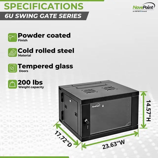 The NavePoint Swing Gate Series, 6U, Wall-Mount Network Cabinet can be used for network closets, retail locations, schoools, IT shops, home users, and any area where space is limited, security is important and routine access to equipment is necessary. This Wall-Mount Network Cabinet has 2 built-in fans to promote airflow to prevent possible overheating of equipment. This Wall-Mount Network Cabinet supports your equipment to a maximum weight of 200 lbs.