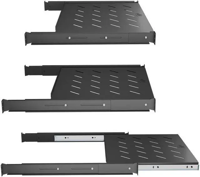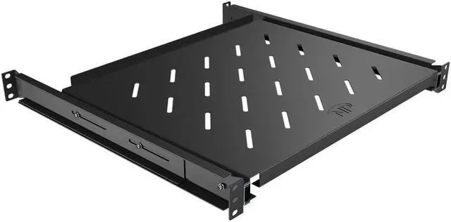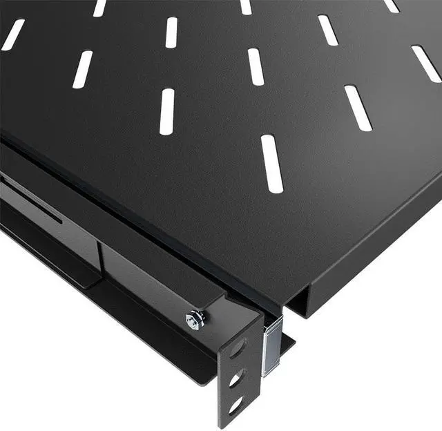 The vented sliding 4-post shelf is available in 17.7 x 19 x 2.1 inch (L x W x H) and takes 1U(1RU) rack space. This cold rolled steel shelf fits into virtually any EIA-ECA 310E compliant 19-inch rack. The rack server shelf comes assembled and with mounting hardware, including 8 x M6 Cage Nuts;8 x M6 Screws;8 x M6 Washers. The 4-post sliding shelf bracket from NavePoint is available in black color and 450mm depth.
