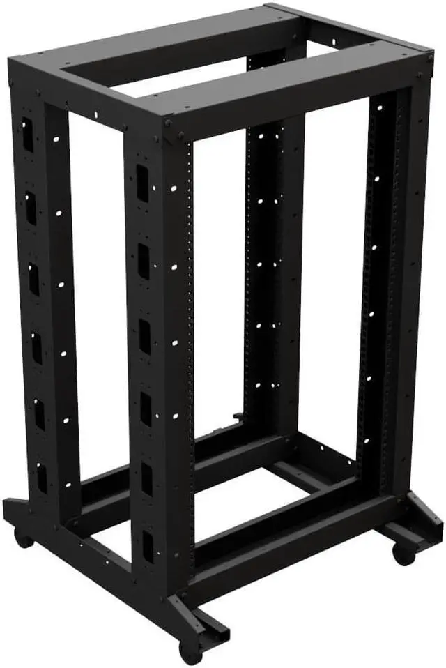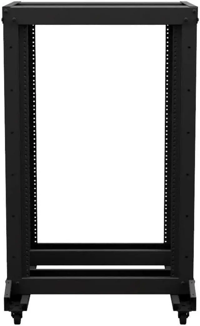 The NavePoint 12-24 threaded 4-post rack features a self-squaring design with bolt-down provisions, as well as the necessary gear for quick construction. The black powder-coated rack's open design allows you to place your networking equipment for quick and easy active access as well as unrestricted airflow. This network rack weighs 53.8 pounds and possesses a weight capacity of 661.38 pounds. The 12-24 threaded RU mounting rails are silk screened with the appropriate markings.