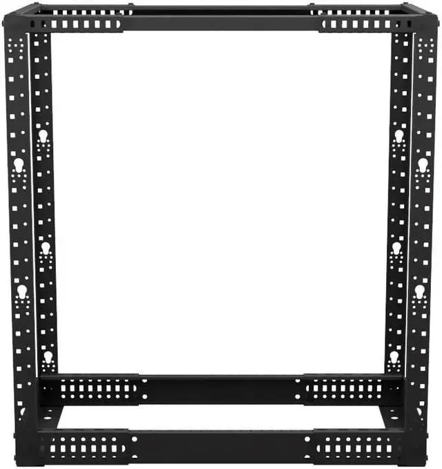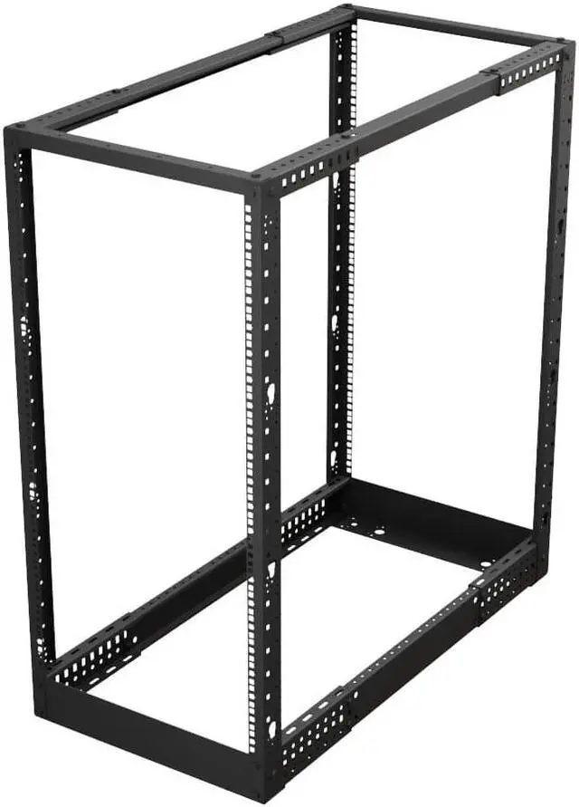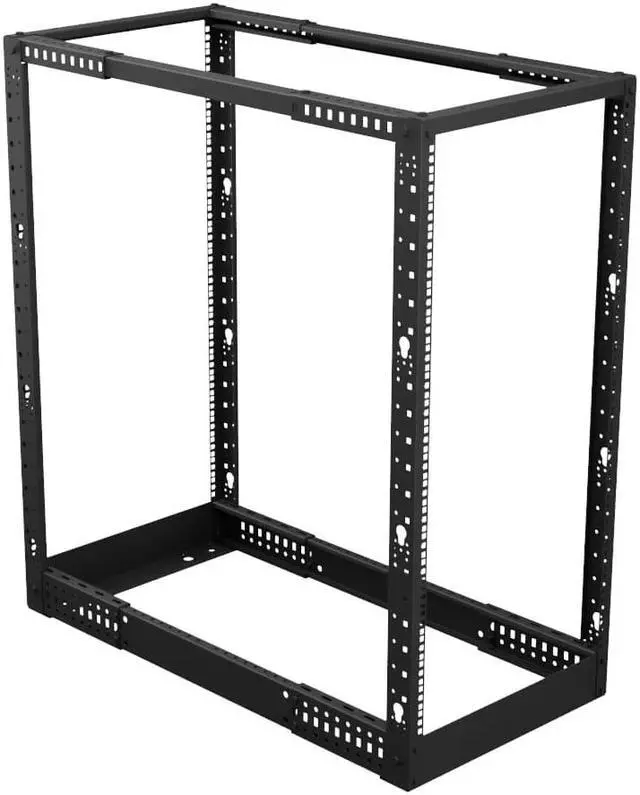 The NavePoint cage nut 4-post rack features a self-squaring design with bolt-down provisions, as well as the necessary gear for quick construction. The black powder-coated rack's open design allows you to place your networking equipment for quick and easy active access as well as unrestricted airflow. This network rack weighs 37 pounds and possesses a weight capacity of 661.38 pounds. The cage nut RU mounting rails are silk screened with the appropriate markings.