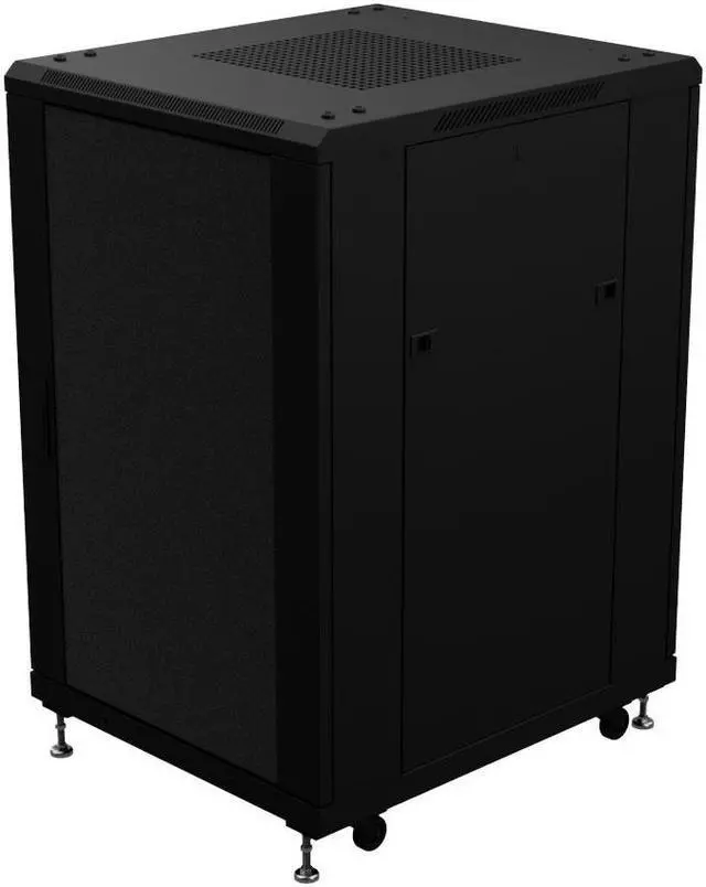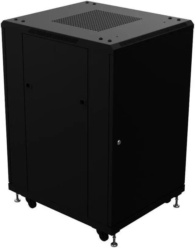 The floor mount caster-included adjustable cabinet enables you to preconfigure racks and then move them into the desired place. These 18U, black cabinets are suitable for AV system installers. The 14 gauge cold-rolled steel audio component racks have swivel casters for mobility, and adjustable feet for use when the fully racked cabinet needs to stay in place. The mounting rails are 10-32 threaded round holes and have RU markings.