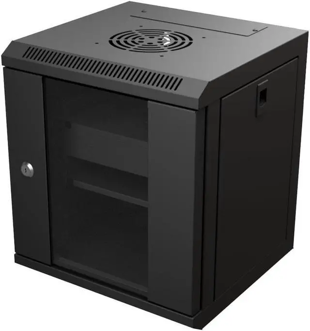 The 6U 10 inch network server cabinet is suitable for mounting deeper server equipment in space-challenging locations like a back-office closet. This wall mountable network cabinet is 13.8 inches in overall height, 12.3 inches in overall width, and 11.8 inches in overall depth with a vented top and glass door. The electro-static powder coated network server enclosure is made of cold rolled steel and has laser knockouts on top and bottom for easy cable routing.