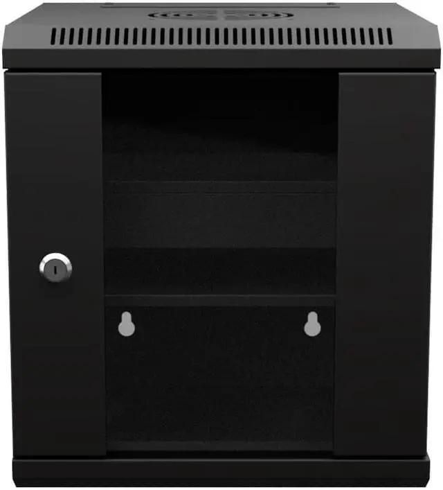 The black 6U network server enclosure comes with 2 x shelves with a max weight capacity of 44lbs each , 1 x 1RU blank panel, and front lock. This space-saving wall mountable network cabinet has an overall max weight capacity of 110.23 lbs and a maximum mounting depth of 7 inches. The lockable electro-static powder coated enclosure with tempered glass, reversible door has removable top and bottom panels. This cold rolled steel cabinet weighs 15.43 pounds and helps secure equipment with access control.