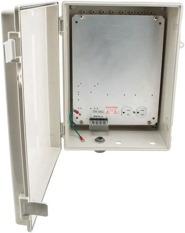 The NavePoint 00406795 14" x 10"x 6" enclosure is a tough weatherproof enclosure that is used for Indoor/Outdoor applications. This NEMA enclosure protects the installed equipment from environmental tampering. The NEMA 4 rated enclosure has a 120 VAC power module and weighs 4.2 pounds.