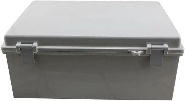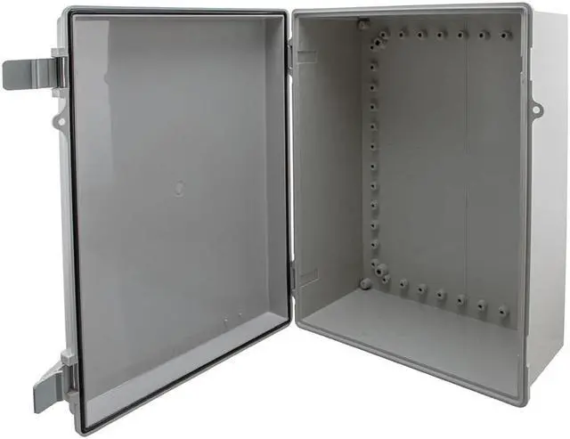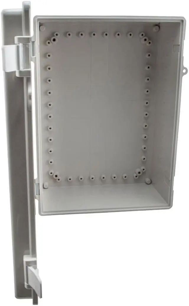 Constructed with a high-impact, UV-stabilized ABS material that delivers superior durability to impact the ease of modification while maintaining a minimum weight, this IP66 NEMA enclosure is well suited for high-temperature or corrosive environments. The NEMA enclosure has raised lid which features a 2-part molded hinge and molded quick release latches with a locking hasp on the lid.