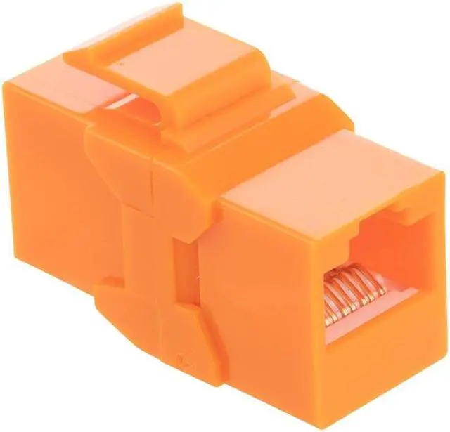 The CAT6A keystone coupler is available in a package quantity of 25 to simplify the installation when populating multiple slots in a rack, panel, or wall plate. These orange RJ45 couplers are constructed of high-impact and fire-retardant high-temperature ABS with Phosphor Bronze, Tin Plated contacts. These UTP inline couplers are compatible with voice, home networking, audio, and video devices.