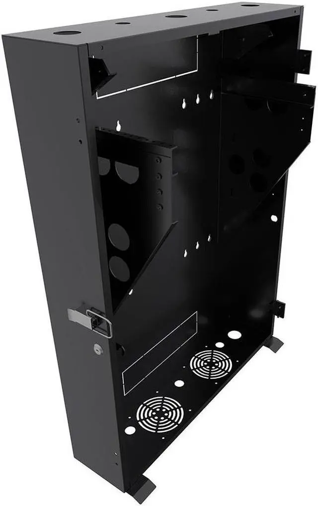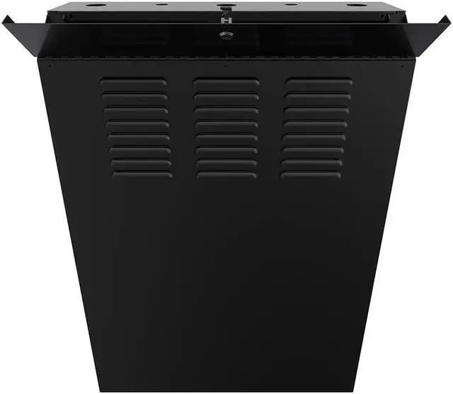 The 5U low-profile cabinet enclosure helps to mount server equipment deeper in smaller space locations such as the back-office closet. This black enclosure comes with laser knockouts on the top and bottom for easy cable routing. You can mount this electro-static powder coated cabinet vertically, which houses deeper equipment vertically while extending only a small depth from the wall. The wall-mount enclosure has a dimension of 9.77W x 25.54L x 34.89H inches.