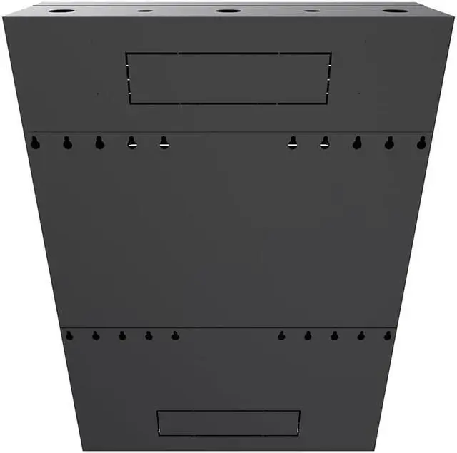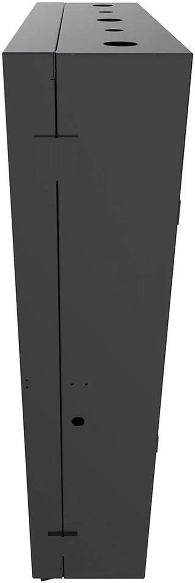 The 4U low-profile cabinet enclosure helps to mount server equipment deeper in smaller space locations such as the back-office closet. This black enclosure comes with laser knockouts on the top and bottom for easy cable routing. You can mount this electro-static powder coated cabinet vertically, which houses deeper equipment vertically while extending only a small depth from the wall. The wall-mount enclosure has a dimension of 7.96W x 25.31L x 34.8H inches.