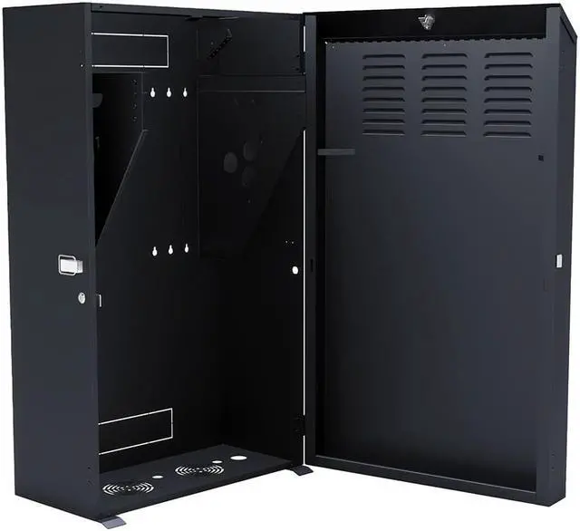 The low-profile vertical wall-mount enclosure is constructed with heavy-duty cold-rolled steel and is suitable for SOHO network installers. The 8U vertical wall-mount enclosure enables equipment installation closer to the destination while being secured with lockable solid doors. The electro static powder-coated enclosure helps to mount server equipment deeper in smaller space locations such as the back-office closet or retail location.