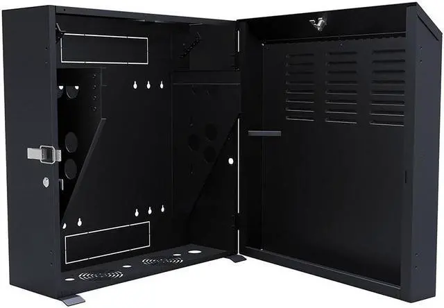 The low-profile vertical wall-mount enclosure is constructed with heavy-duty cold-rolled steel and is suitable for SOHO network installers. The 6U vertical wall-mount enclosure enables equipment installation closer to the destination while being secured with lockable solid doors. The electro static powder-coated enclosure helps to mount server equipment deeper in smaller space locations such as the back-office closet or retail location.