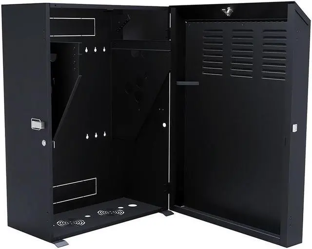 The low-profile vertical wall-mount enclosure is constructed with heavy-duty cold-rolled steel and is suitable for SOHO network installers. The 8U vertical wall-mount enclosure enables equipment installation closer to the destination while being secured with lockable solid doors. The electro static powder-coated enclosure helps to mount server equipment deeper in smaller space locations such as the back-office closet or retail location. This wall-mount enclosure has anti-theft top and left side locks that provide security and as trouble-free maintenance cable management punch-outs to keep the equipment from overheating. The black low profile wall-mount enclosure allows suspending the cables to keep wires out of the way.