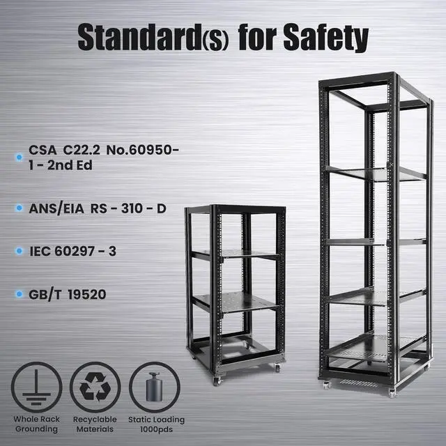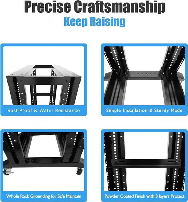 Raising Electronics Open Racks - Solid, Versatile, and Premium Quality Made; Organize and Secure your Rack Mount Equipment. This premium quality 4 post open rack is designed to accommodate different installations for equipment from different manufactures. The adjustable depth up to 17" post to post is a great feature that will fit most of the server installation on the market. This rack is made of 5MM SPCC Cold Rolled Steel to provide you with a maximum load of 700LB. With the heavy duty materiel, it provides your with exception stability. Flat packed for easy shipping and require some assembly.
