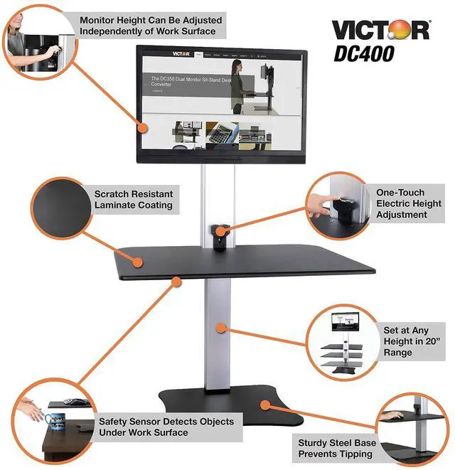 Victor High Rise Electric Single Monitor Standing Desk Workstation - Supports One Monitor of Any Size Up yo 25 lbs - 0" to 20" Height x 28" Width x 23" Depth - One-Touch Electric, Standing Desk, Sit-Stand Desk, Ergonomic Workstation, Desk Converter, Height-Adjustable Table - No Clamping or Attachment - Wood, Steel, Aluminum - Black, Aluminum - VESA Mounting Holes Required Transform any sit-down desk into a sitting or stand-up desk with the DC400 Electronic Standing Desk Workstation. The 28" wide x 23" deep worksurface is raised up to 20" for ergonomic placement of monitor, keyboard, mouse, telephone and papers while standing.