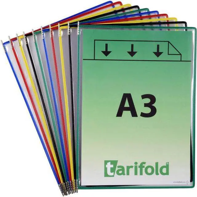 Tarifold W291A3 wall mount reference system provides quick and easy access for international size A3 documents. This wall unit comes complete with hardware, A3 sized display pockets in assorted colors and color-coded insertable index tabs for quick reference. Reversible pluggers allow angled mounting to hold pages open. The Tarifold W291A3 wall display unit is protected by a 10-year product warranty.