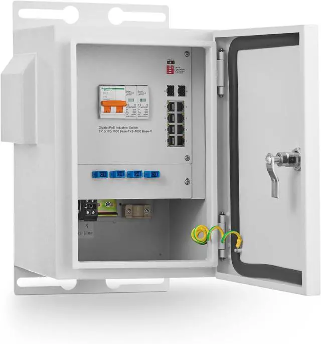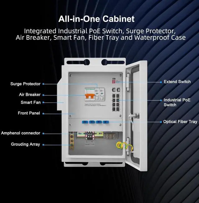 | Cabinet Components | Fan: AC220V with temperature control, 3000±10% RFM, air volume 90CFM, 92*92*25mm, line length 300mm; Optical fiber box: 4-port SC fiber flange, with 8-core fiber box; Air breaker: It has short-circuit protection, overload protection and isolation functions and has thermal-magnetic tripping characteristics C-shaped curve (5ln~10ln); Installation: Pole /Wall installation |