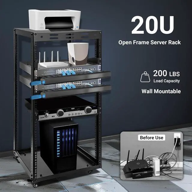 Ample Storage Space: In addition to being equipped two 1U rack shelves and 5ft hook and loop straps, this open frame it rack also features an top and bottom platform design in order to provide you with more storage space