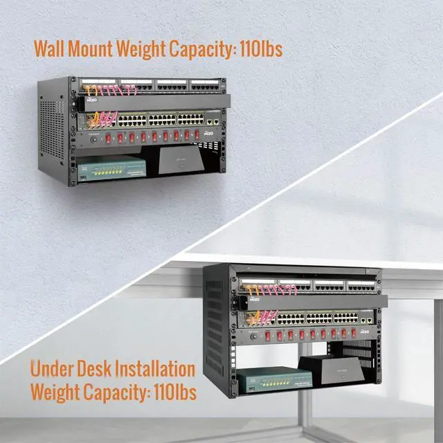 Direct use:Open and use, not having to assemble it.Network rack can be placed flat or mounted on the wall,also can be installed vertically under the table