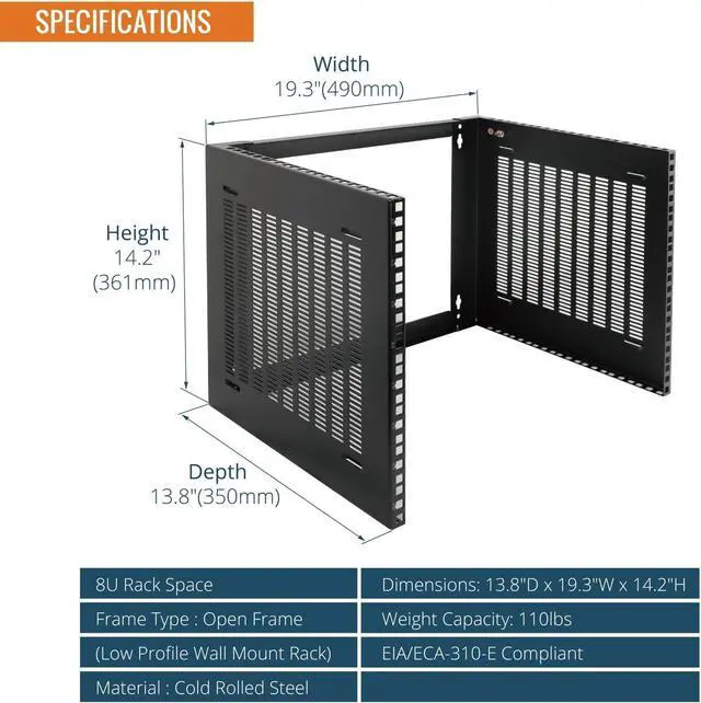 Application:EIA/ECA-310-E Compliant;wall mounted 8u rack fits all 19" racks and cabinets to hold various IT, network, and AV equipment;wall mount rack available in 4U, 6U, and 8U to choose