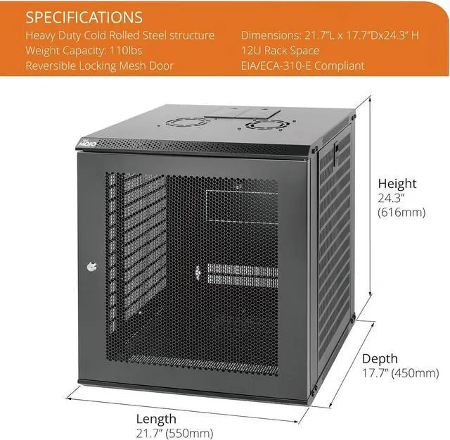Save valuable floor space: 12U wall mount server cabinet Dimensions: 24.25" H x21.65" W x17.72" D. MAXIMUM MOUNTING DEPTH is 14.2".