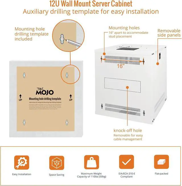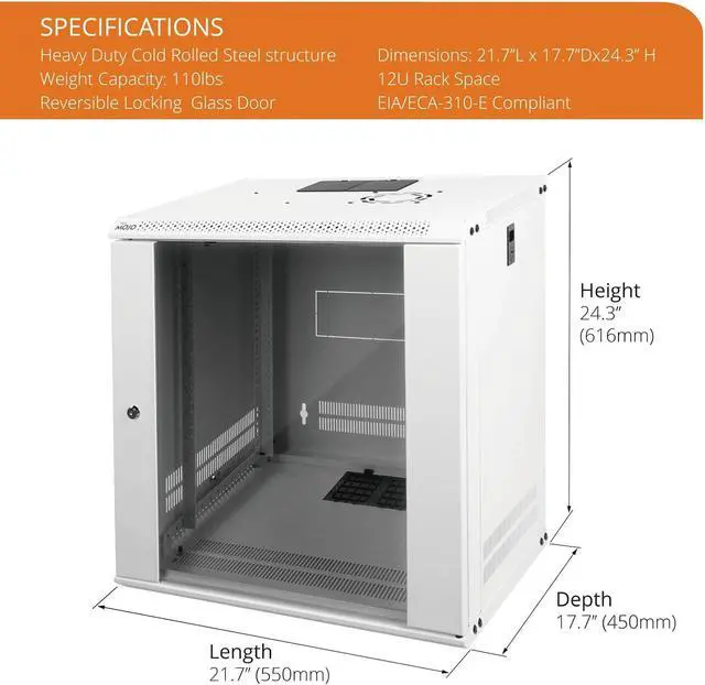 Save valuable floor space: 12U wall mount server cabinet Dimensions: 24.25" H x21.65" W x17.72" D. MAXIMUM MOUNTING DEPTH is 14.2".