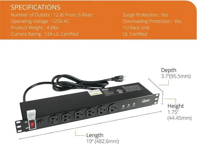 Built-in Circuit Breaker: The PDU is equipped with a built-in 12-amp circuit breaker that protects against circuit overloads. This ensures reliable performance and helps prevent damage to your equipment.